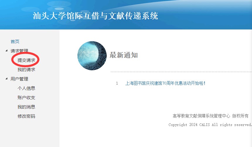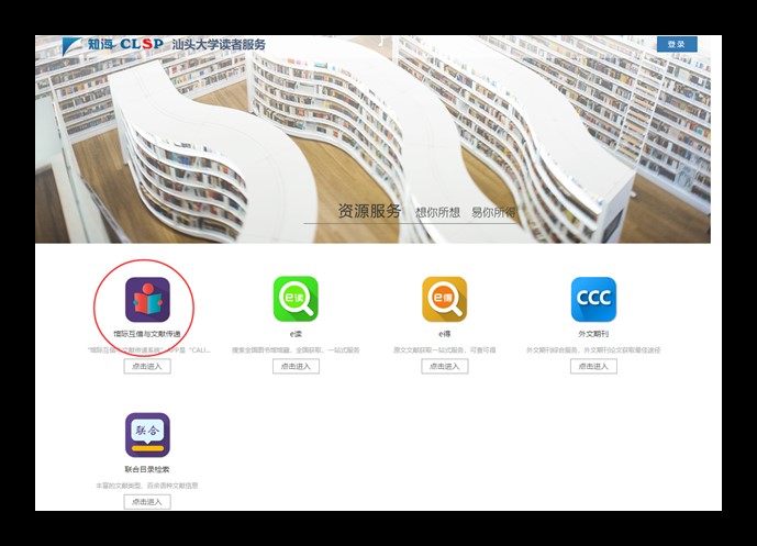 方法一:登录读者门户https://ill.calis.edu.cn/reader/index.html?tenant=a002111&auth=true 通过网页上的e得,e读,外文期刊,联合目录进行文献检索,检索到所需文献后,点击文献传递申请,转到所在馆的登录界面登录即可提交。
