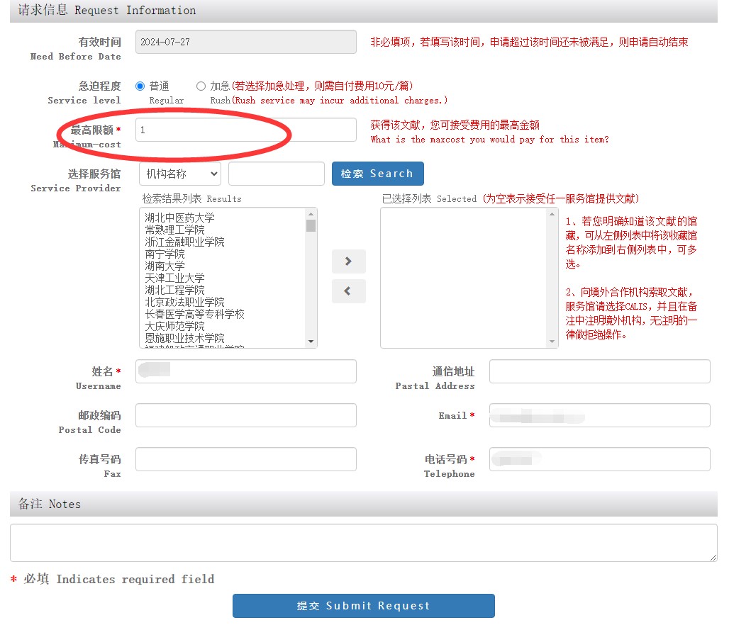 在请求信息栏:最高限额填写获得该文献,您可接受费用的最高金额(不低于1元,此项为必填项),最后点击提交即可