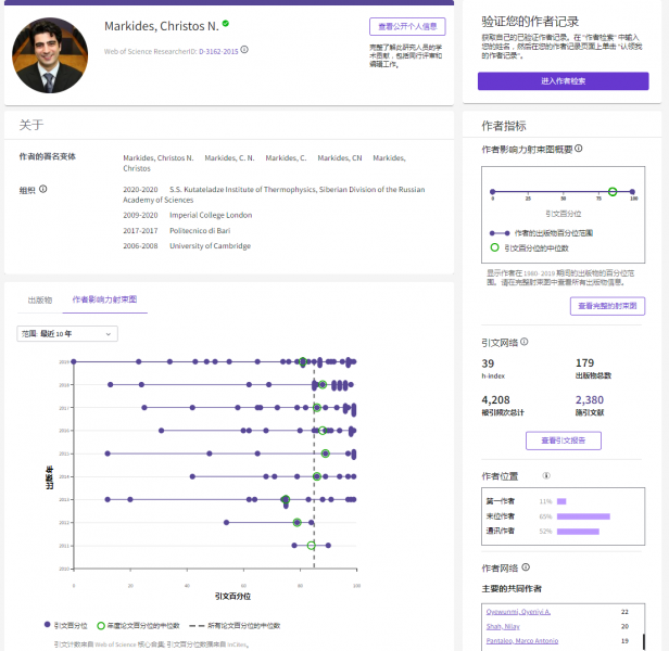 新版Web of Science平台支持通过作者姓名与Author Identifiers进行作者检索,同时支持“偏好姓名”检索(姓名变体)。用户可以在检索结果页面合并、更正清理、认领作者记录。全新的作者记录融入射束图及更多信息,全方位展示研究人员个人学术成果及学术影响力。